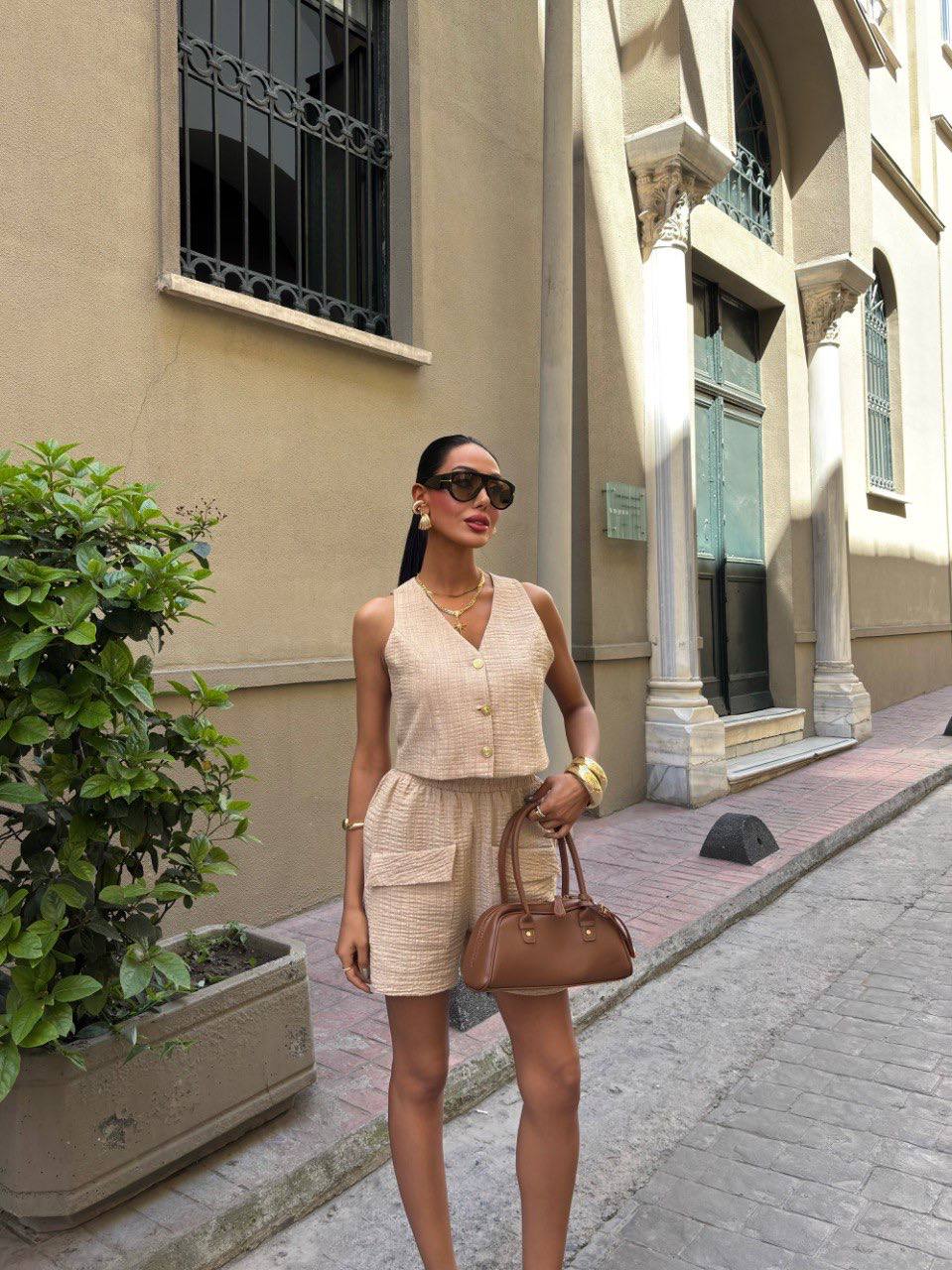 Un ensemble texturé beige clair, accessoirisé de doré et de brun. Frais, élégant, parfait pour une journée en ville.